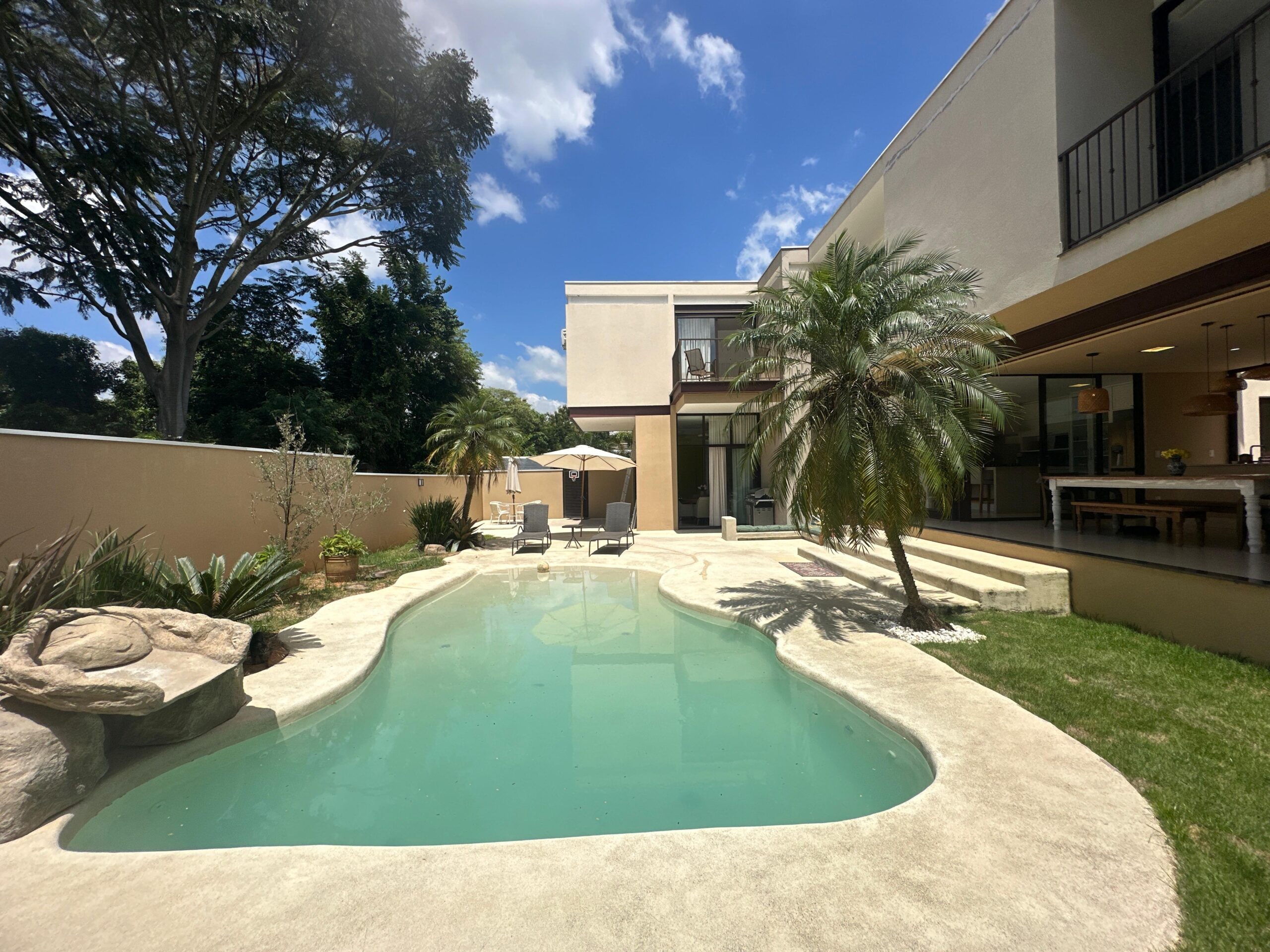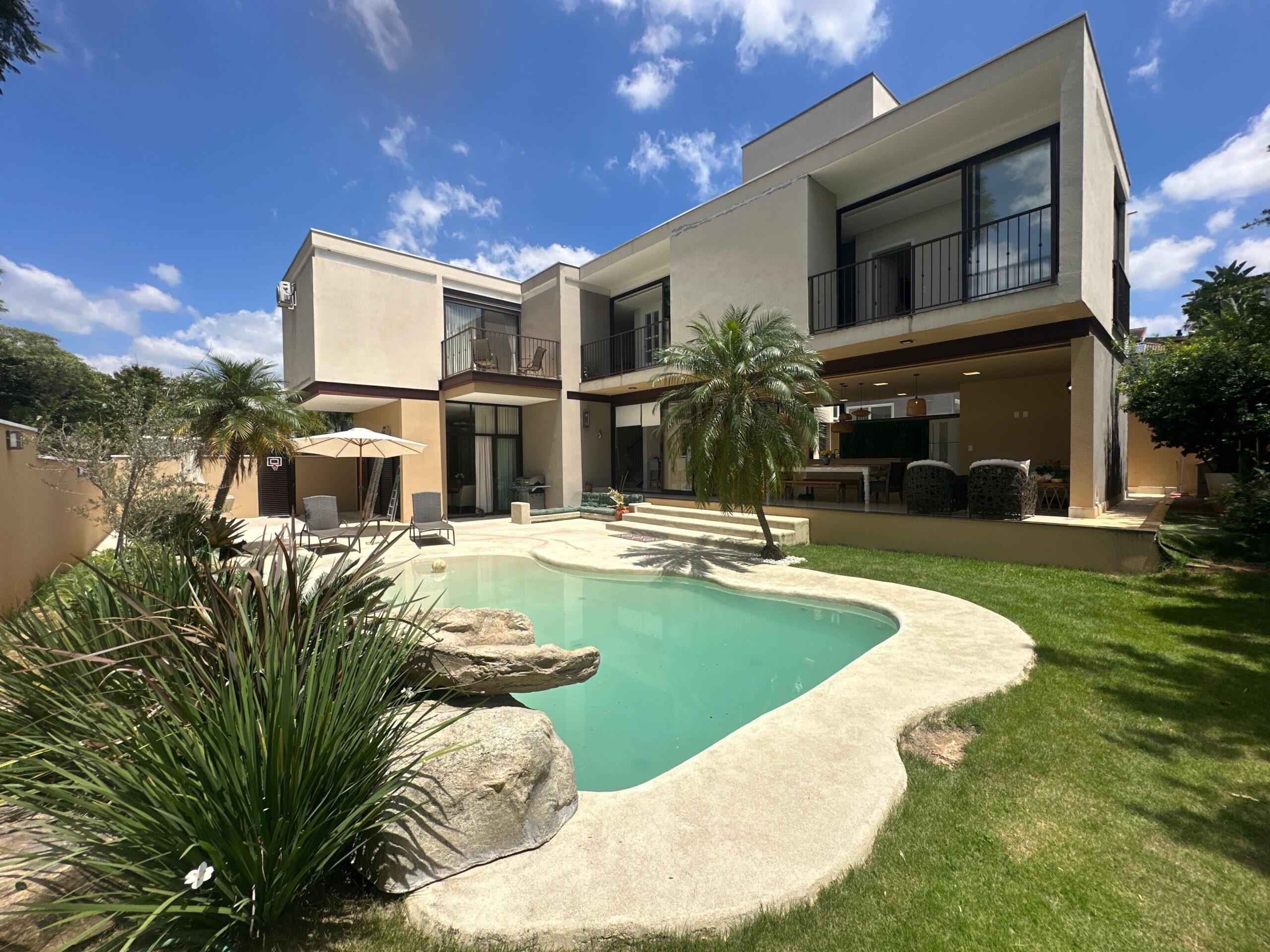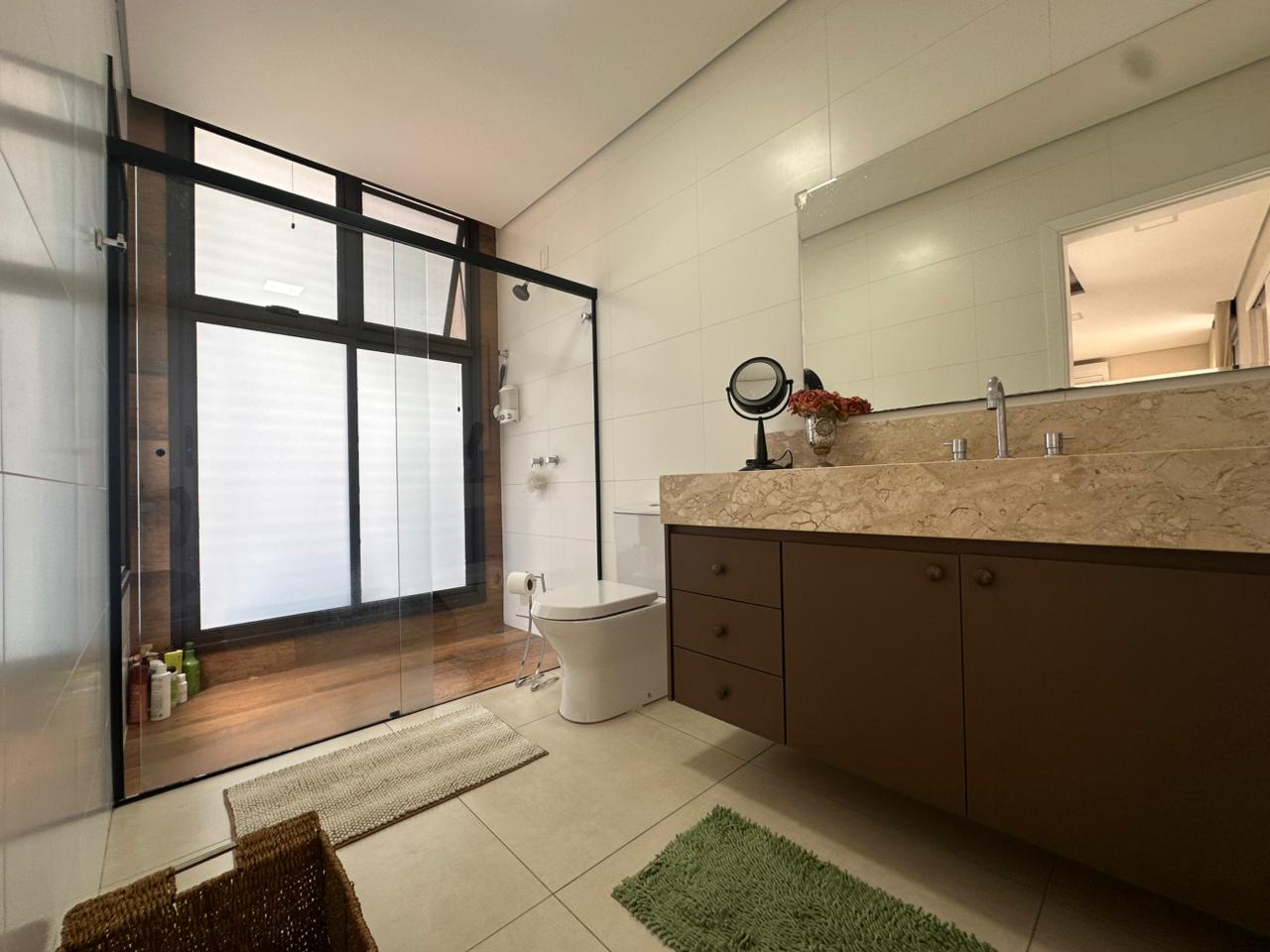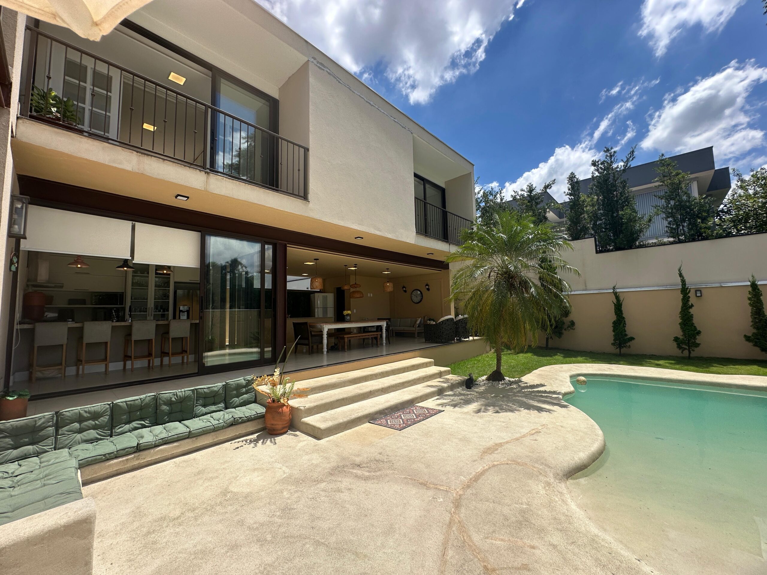 Um dos sobrados mais lindos do Swiss Park! Imóvel com diversas características que vão te encantar: casa feita em L, construida com estrutura metálica com arquitetura feita pelo Marcelo Salve. Logo na entrada temos a sala de tv com a sala de jantar/copa, lavabo, cozinha americana e espaço gourmet com vista para o lazer, banheiro de uso externo, lavandeiria, 3 suites no piso superior sendo a master com um generoso closet, sacada com vista para a area verde e um viveiro. Corredor aberto de acesso para as outras suites garantindo muita iluminação. Roupeiro e tambem um espaço de escritório para 2 pessoas. A area de lazer conta com uma piscina de piso monolítico (areia compactada) com iluminação, cascata e gramado ao redor. Possibilidade de colocar elevador (tudo esta pronto) e tambem um fireplace. A casa será vendida mobiliada. Agende ja sua visita!